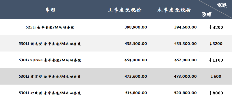 ●BMW 5系免税车:大部分五系车型价格↓下调600-4300元,除(530行政型上涨)